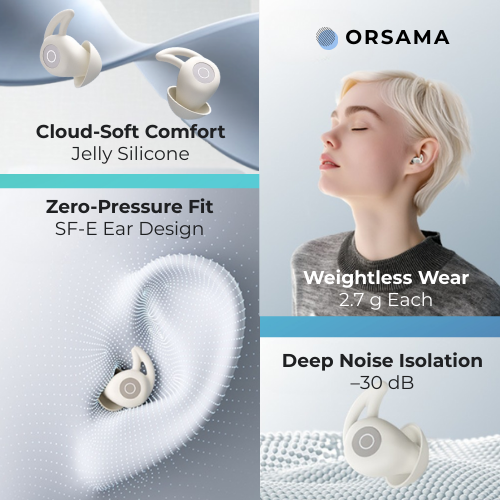 ORSAMA SnoozePods SleepBuds connect via Bluetooth to any app on iOS, Android, or laptop. Stream white noise, rain sounds, audiobooks, or meditation tracks — whatever helps you drift off peacefully.